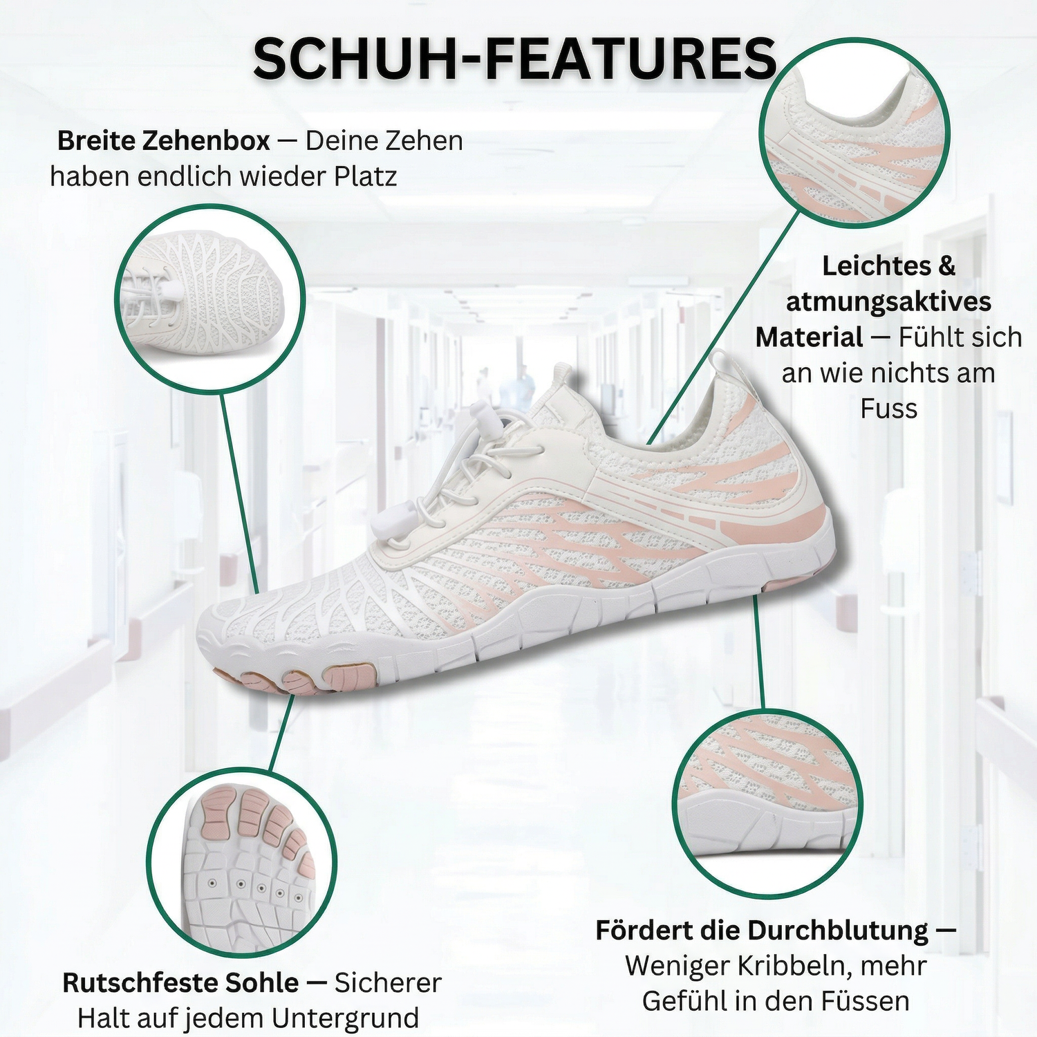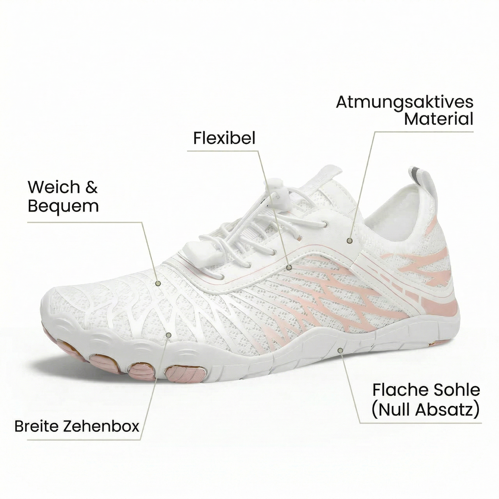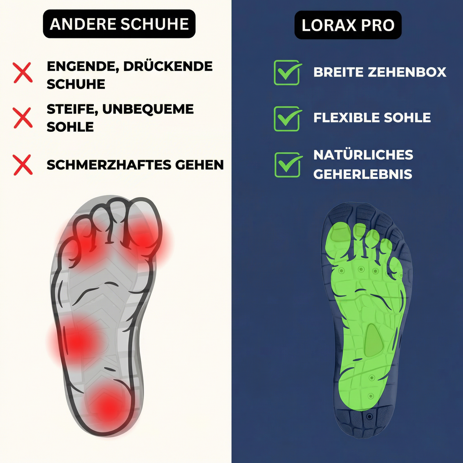 ✓ Breite Zehenbox — Deine Zehen waren nie dazu gedacht, zusammengepresst zu werden. Hier haben sie endlich wieder Platz — und können arbeiten.
