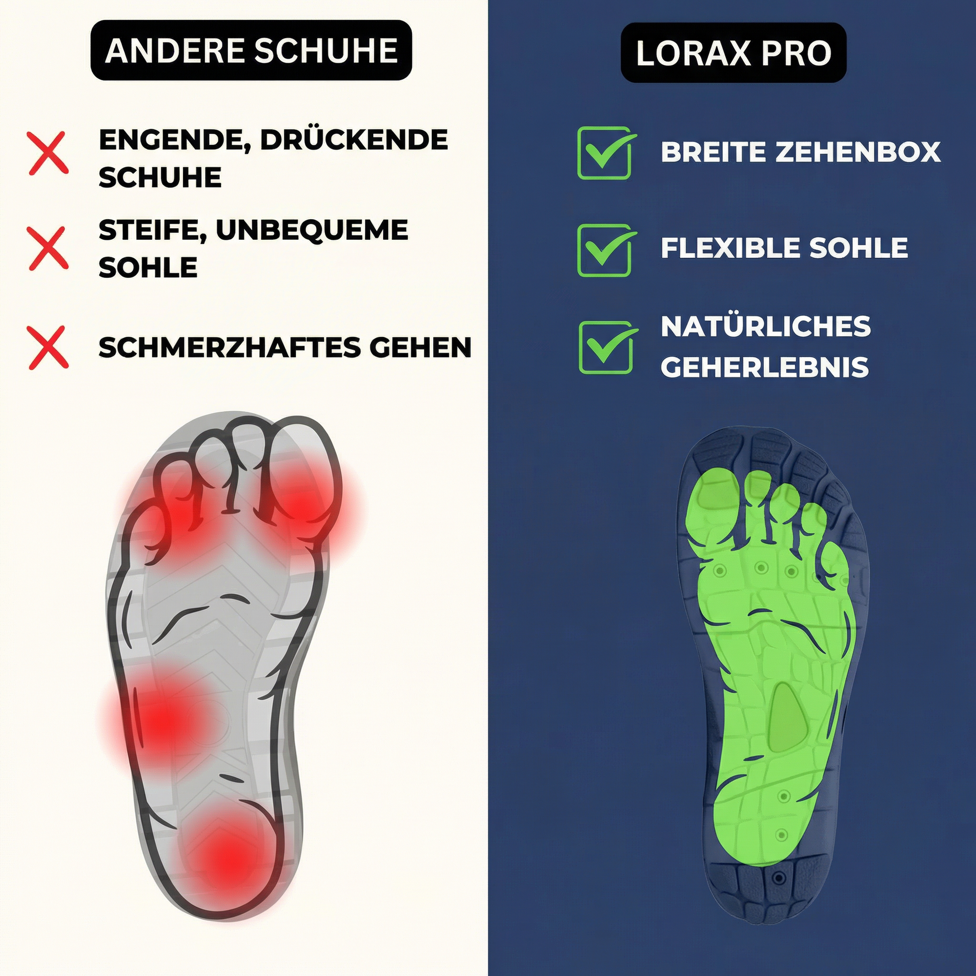 ✓ Natürlicher Gang — Dein Körper weiss, wie er laufen soll. Der Lorax Pro lässt ihn es wieder tun — und deine Fuss- und Beinmuskeln werden Schritt für Schritt stärker.
